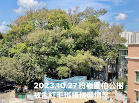 然而,今天我們看到粉嶺圍伯公樹的遭遇卻是令人嘆息不已。這棵高約15公尺、濶約18公尺的「伯公樹」,佇立粉嶺(南)圍以百年計,但自2021年5月7日始,該株細葉榕樹因為食葉害蟲朱紅毛斑蛾的侵襲,樹冠變禿,葉片脫落,每年三次受傷害,到了今年7月已經超過十次之多。由於香港政府於上世紀80年代發展粉嶺/上水新市鎮,粉嶺圍村民初期便與政府協定,將村前土地交予政府發展道路和公共設施,從此「伯公樹」所在之地便屬於官地,樹木便變成無人主動管理的「官地樹」。2019年香港的世紀榕樹蟲害朱紅毛斑蛾來襲,受傷的「伯公樹」唯有利用自身的儲備能量,自我修復一次又一次的蟲害葉損失情況,一般重新長葉都是需時1-2個月的,但是今年7月時的第二代朱紅毛斑蛾幼蟲的侵襲,令致「伯公樹」全株百分百光禿,碳(能量)衰竭死亡。四個月後的今天,樹冠上滿佈枯枝斷技,主枝、側枝和樹幹都呈現不同程度的腐朽、樹皮爆裂和長出真菌子實體,造成潛在的樹木安全隱患。政府負責的部門在接獲市民報告之後,隨即派員檢查和先移走危險斷裂部份,以防意外傷人。今日(21/11)開始便會移除整株危險樹木,徹底解決公眾安全問題。
